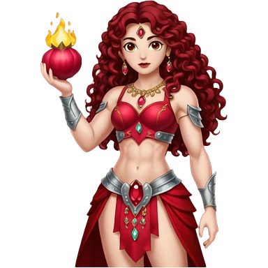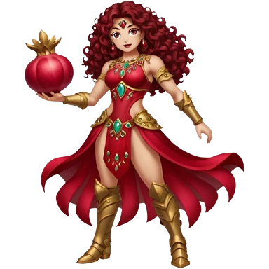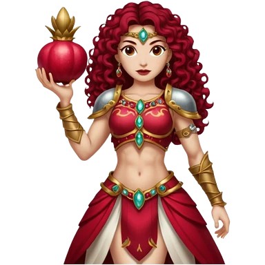 full body woman long curly brown hair brown eyes white skin tattoos muscular build pomegranate empress armor split open jewel seeds glow emoji