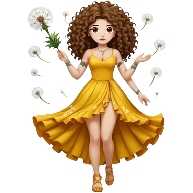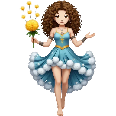 full body woman long curly brown hair brown eyes white skin tattoos muscular build dandelion seed spirit dress made of floating fluff emoji
