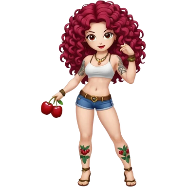 full body woman long curly brown hair brown eyes white skin tattoos muscular build cherry twin fruit hair ornaments, flirty battle pose emoji