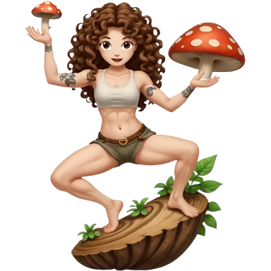 full body woman long curly brown hair brown eyes white skin tattoos muscular build barefoot spiral dance on mushroom caps emoji