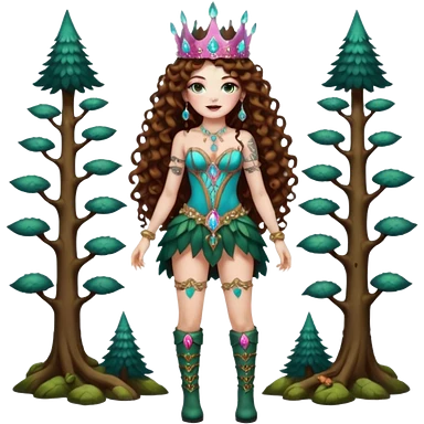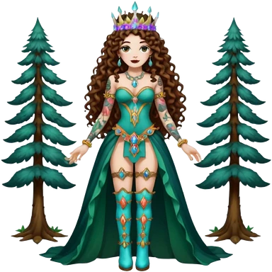 full body view of a woman with long curly brown hair, brown eyes, white skin, tattoos, wearing a crystal crown and thigh-high boots, psychedelic forest empress pose emoji