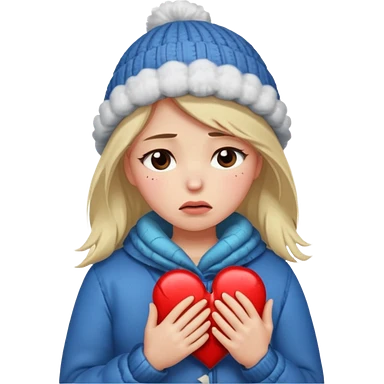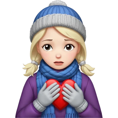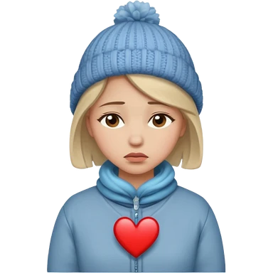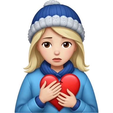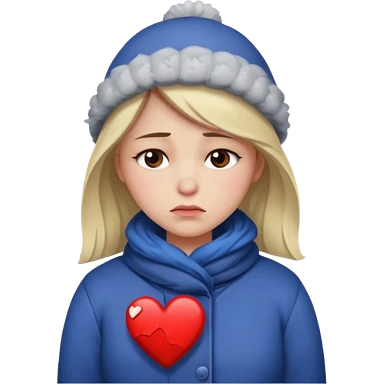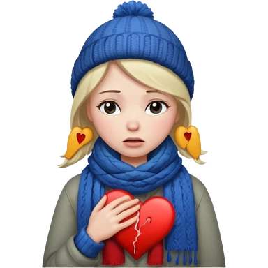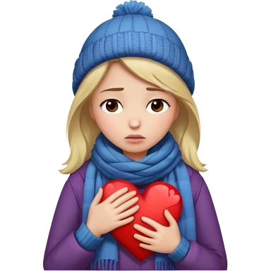 woman broken hearted, looking down sad, about to cry. holding her heart breaking, wearing a winter outfit emoji | AI Emoji Generator