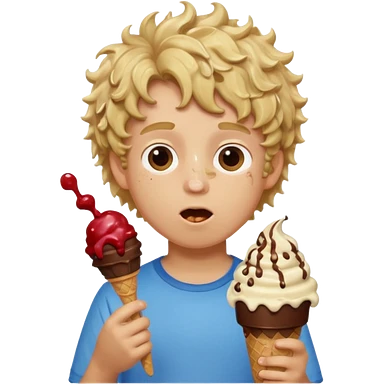 boy blonde curly hair, chef, eating big chocolate ice cream emoji