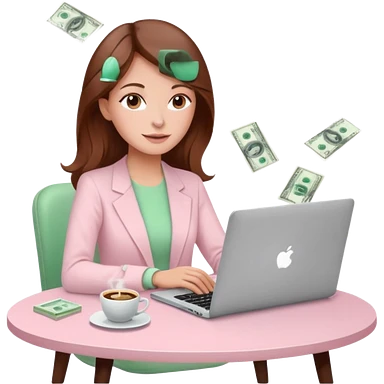 woman character with laptop and coffee in Paris, dollars coming out from the screen floating, colorful chic outfit, white laptop, Pixar style, black hair, fair skin, emoji | AI Emoji Generator