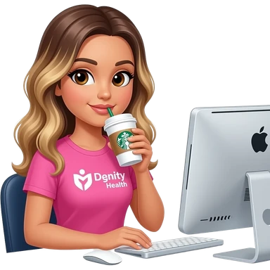 Woman drinking Starbucks coffee in Apple computer, balayage hair, long hair. Brown eyes , round face, pink outfit, dignity health logo on shirt emoji