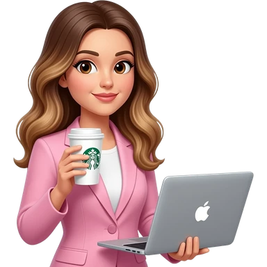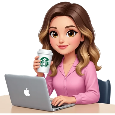 Woman drinking Starbucks coffee in Apple computer, balayage hair, long hair. Brown eyes , round face, pink outfit emoji