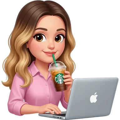 Woman drinking iced Starbucks coffee in Apple computer, balayage hair, long hair. Brown eyes , round face, pink shirt emoji