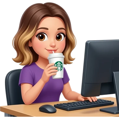 Woman drinking Starbucks coffee in computer, balayage hair, mid length. Brown eyes , round face, emoji
