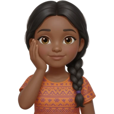 brown skin, long black hair in a braid, orange dress with purple patterns girl who is face palming with her hand covering half of her face. face palm as in slapping her forehead emoji
