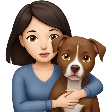 A woman with dark hair and brown eyes is hugging a ball over brown pitbull femail dog with golden eyes with cropped ears emoji