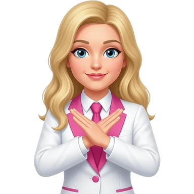 long blonde haired woman gesturing "No" arms crossed in front of her. wearing a white and pink business suit. emoji