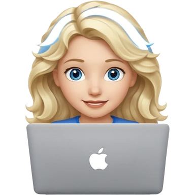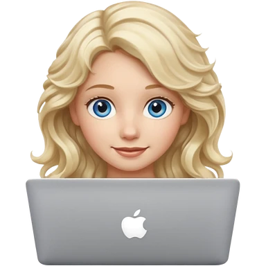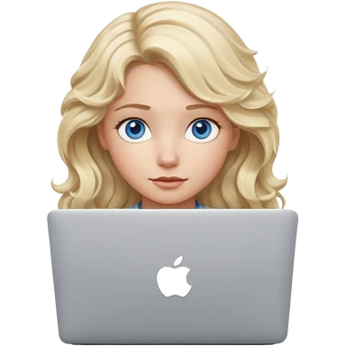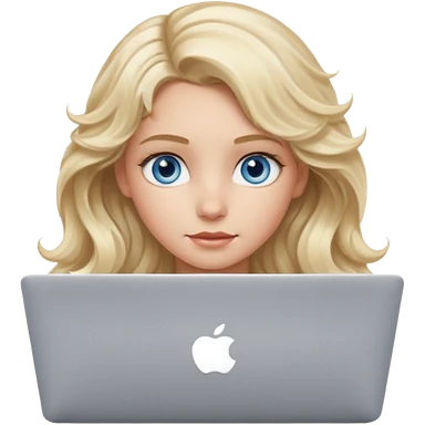 blond girl, blue eyes, hair wavy, , behind her silver colored laptop from apple, she looks straight infront of her, looks a bit taller emoji
