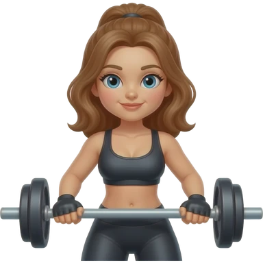 brunette woman in light blue gym clothes lifting a barbell, determined expression, clean background emoji