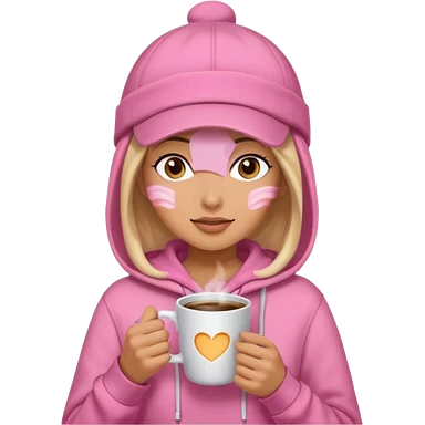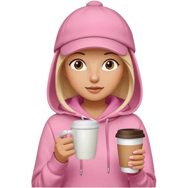 Woman in pink hoodie and cap holding coffee emoji | AI Emoji Generator