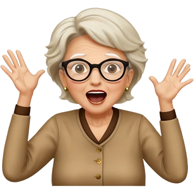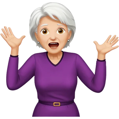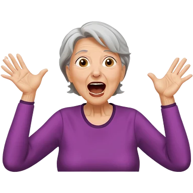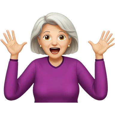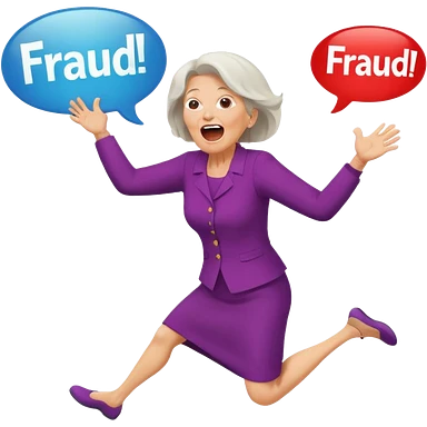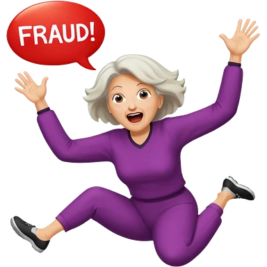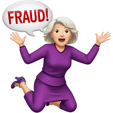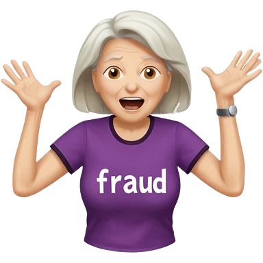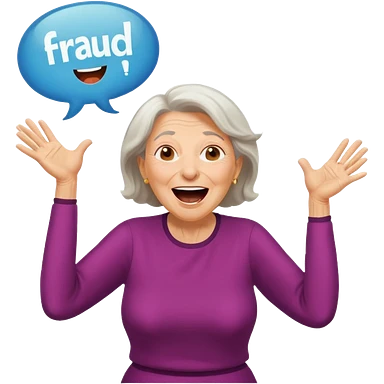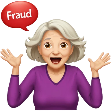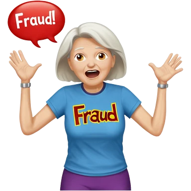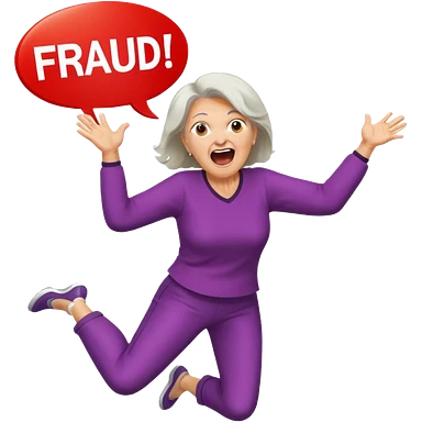 Older Woman jumping screaming and word “fraud” in a bubble emoji
