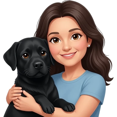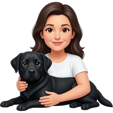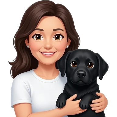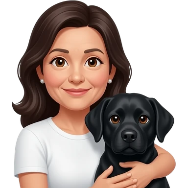 woman, middle aged, long dark hair, small earrings, brown eyes, cuddling black labrador, white t-shirt emoji