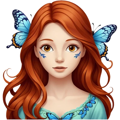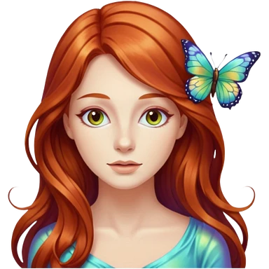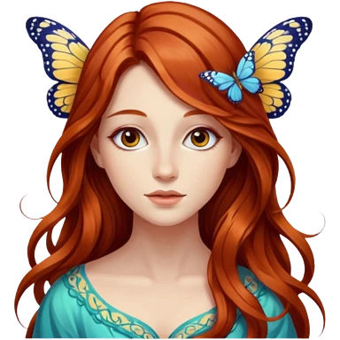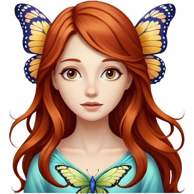 Woman with long flowing auburn hair wearing a butterfly emoji