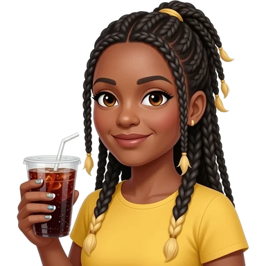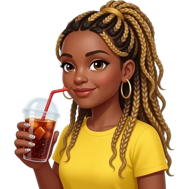 professional thick black woman in her 40s with long thin hair braids with blond tips pulled some up some down wearing a yellow top and holding cup of soda- her nails are painted with a design emoji