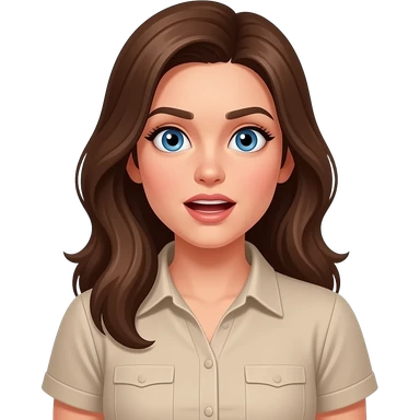 Make a white female with brown hair and blue eyes. Have them wear a beige short sleeved shirtmake the emoji look both excited and confused emoji