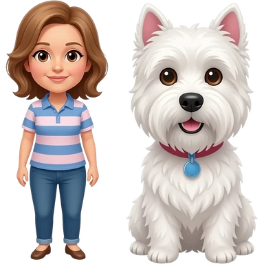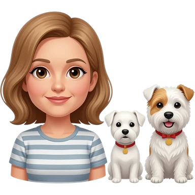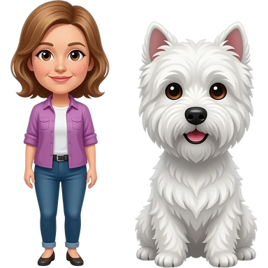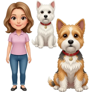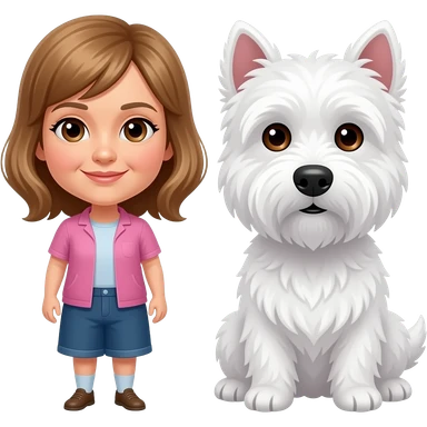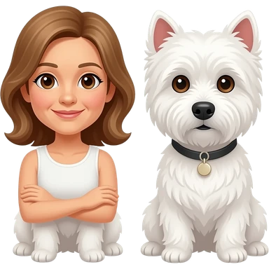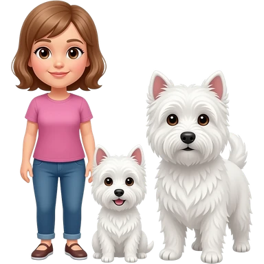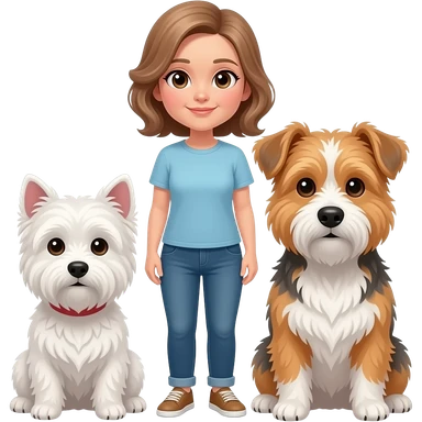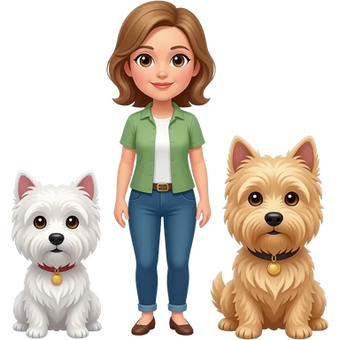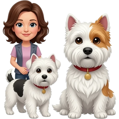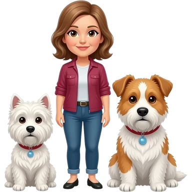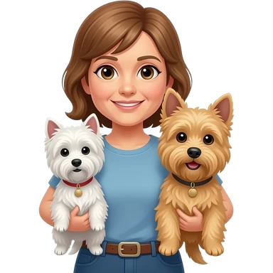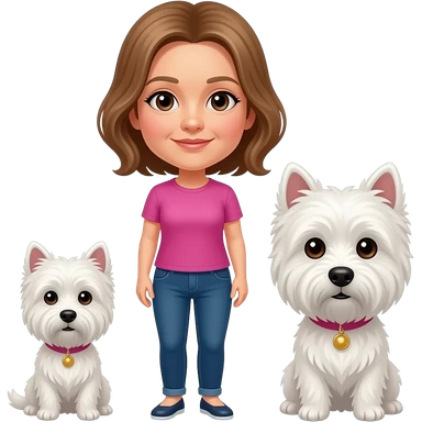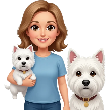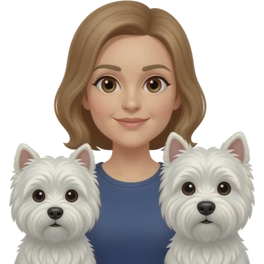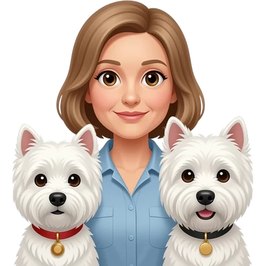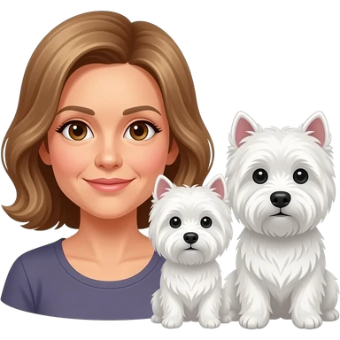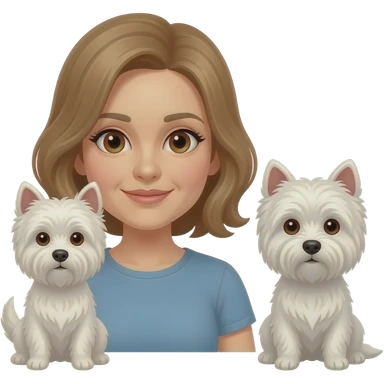 Middle age woman brown eyes , shoulder length light brown hair, with a female westie and a male westie emoji