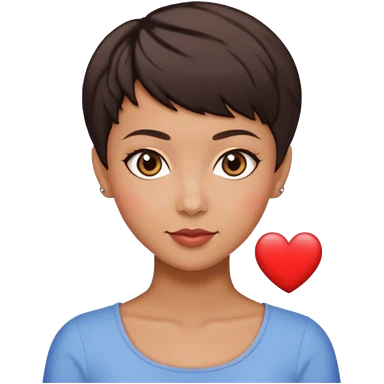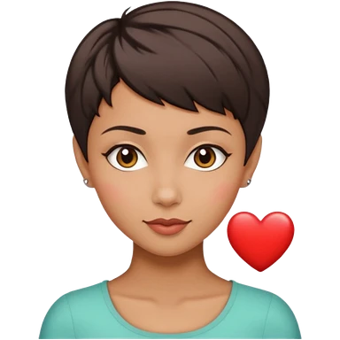 woman pixie cut dark brown hair, tan skin, brown oval eyes, heart shaped face emoji