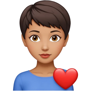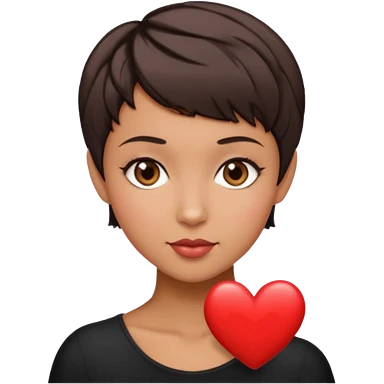woman pixie cut dark brown hair, tan skin, brown almond eyes, heart shaped face emoji
