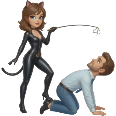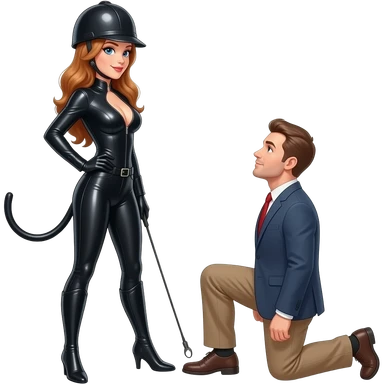 woman in a catsuit with a riding crop standing over a man kneeling at her feet, facing towards her, and looking up at her emoji