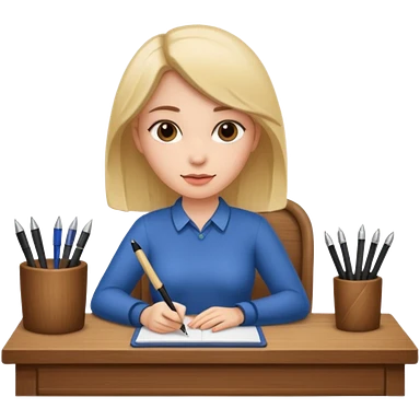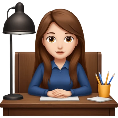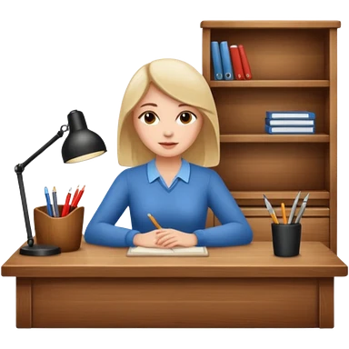 lawyer woman, sitting at a desk with law books, glasses, focused emoji