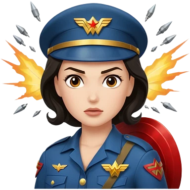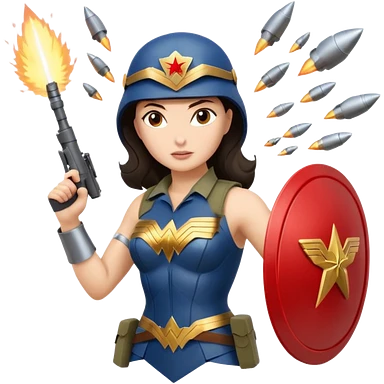 Female full confidence battle ready soldier heroically saving lives accompanied by Wonder Woman , with shelling happening all around emoji
