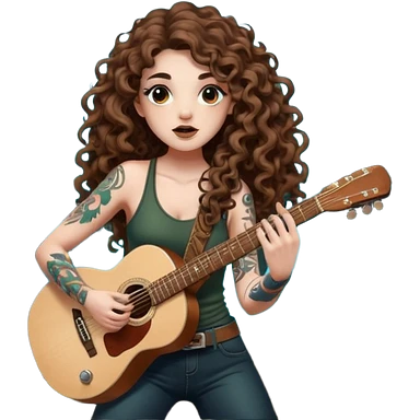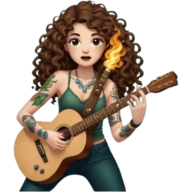 woman with long curly brown hair, brown eyes, white skin, tattoos, blowing glowing forest spores like stage smoke after a guitar solo emoji