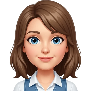 Woman drinking coffee in computer, balayage hair, mid length. Brown eyes , round face, emoji