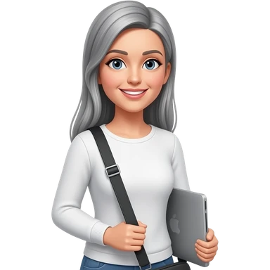 woman with long straight gray and long sleeve white top and laptop bag hair from the back as she walks out emoji