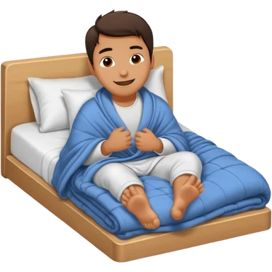 A man in bed under covers kicking feet because so excited to sleep. Eyes are closed and he is smiling. emoji