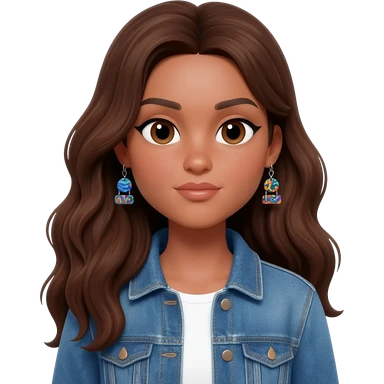 a white young woman with very long wavy dark brown/chocolate hair with curls at the end of her long hair typing in a computer. she's using round glasses, her lips are light red and her cheeks slightly pink. Her eyes are dark brown. She's using a dark blue knit sweater emoji