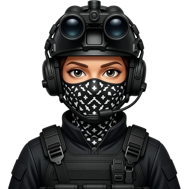 woman wearing a black special tactics medical force outfit and a black COMBAT BOOTS PLATEface total painted black and a black and white patterned balaclava and wears a headset and a big black night vision device on his headtop with a helmet and a mask emoji