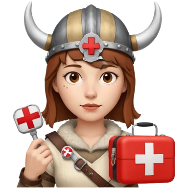 A young woman with short, chestnut-brown hair, styled in a Viking fashion and wearing a horned helmet. She holds a medical kit with a red cross icon in her hand. A stereoscope hangs around her neck. emoji