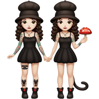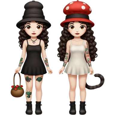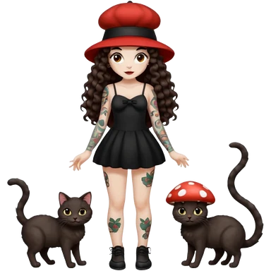 full body woman long curly brown hair brown eyes white skin tattoos black cat at feet, both wearing matching mushroom hats emoji