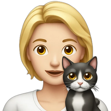 A white woman with black hair and green eyes hugs a black cat with a stripe on her face emoji