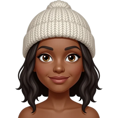 Create an emoji illustration of a smiling young woman with long, wavy dark brown hair and fair skin. Her face shape is oval and slightly round. She is wearing a black knit beanie and a black coat over a soft light pink top. She has dark green eyes and a natural smile. emoji