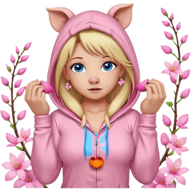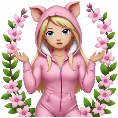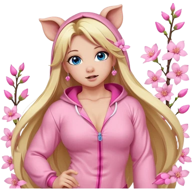 sexy and muscled, full body, in pink kegurumi pijamas, pig hood, sexy woman, long blond hair, beautiful blue eyes, makeup, earrings, muscled, surrounded by pink flowers and sakura petals emoji