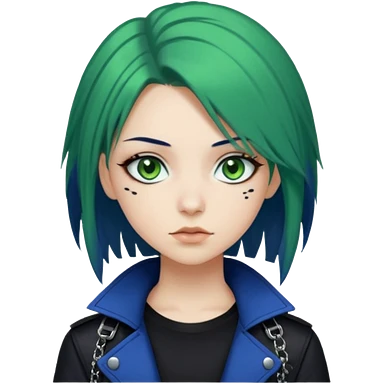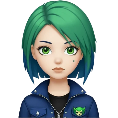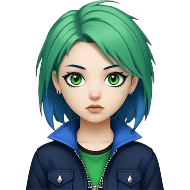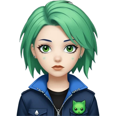 woman with white skin and green eyes, her hair is shoulder length black with navy blue hime cut layers, wearing green and blue y2k and punk themed clothes emoji