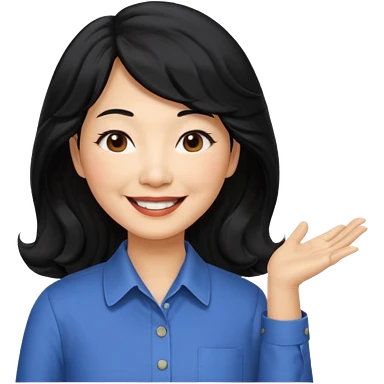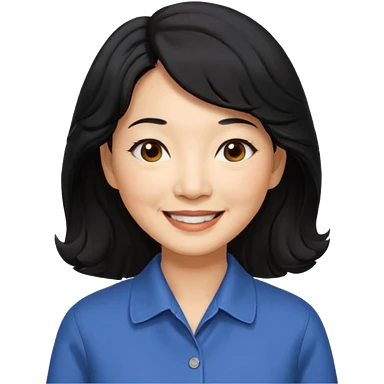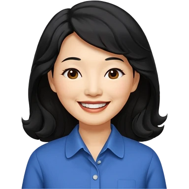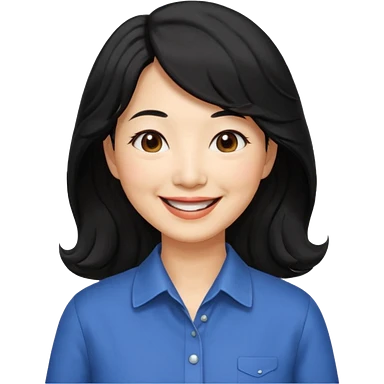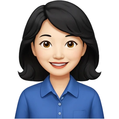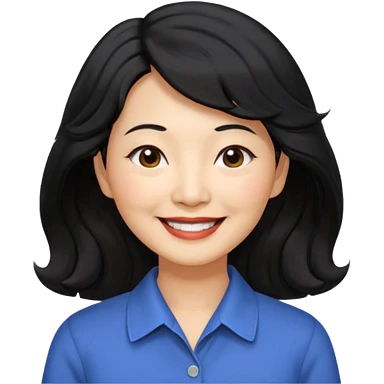 60 yr old asian woman, wavy thick black hair past shoulder length, side part, side swept bang, big smile, collared shirt emoji
