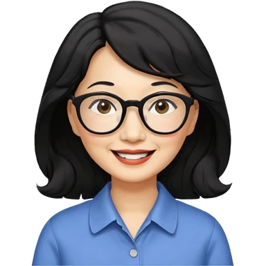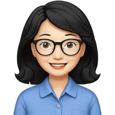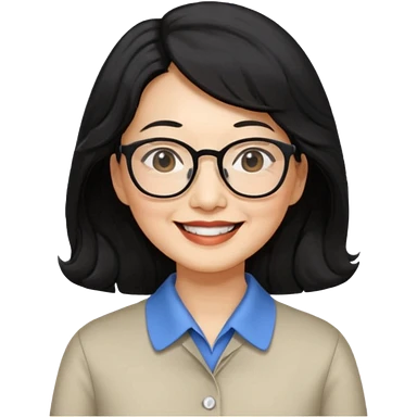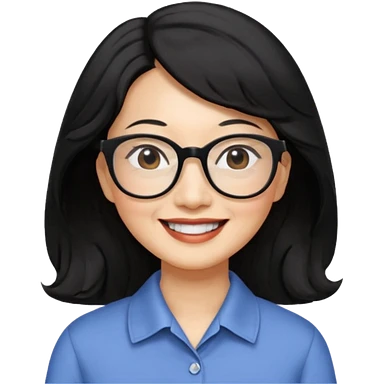 60 yr old asian woman, wavy thick black hair past shoulder length, side part, side swept bang, big smile, collared shirt, long hair, glasses emoji