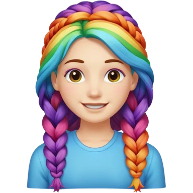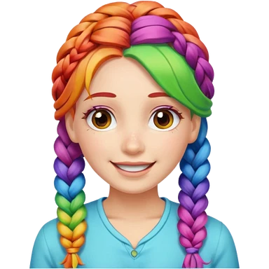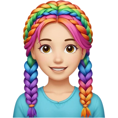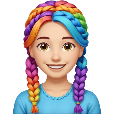 Woman with braided rainbow hair, happy — long braids fading from pink to blue emoji