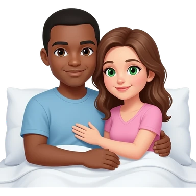 Short hair Dark skin black man and brown hair white woman with green eyes cuddling in bed emoji