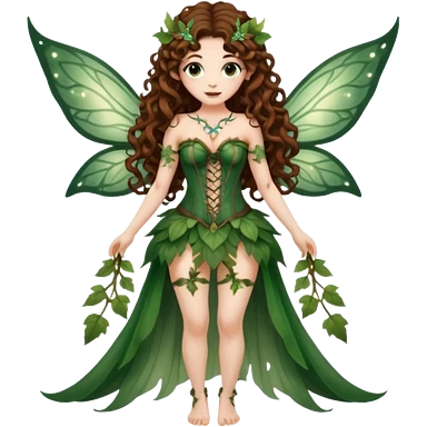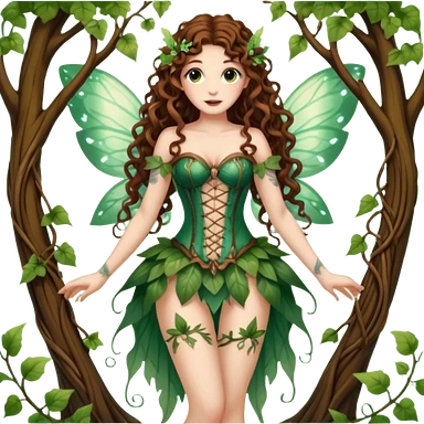 full body woman long curly brown hair brown eyes white skin tattoos dressed as glowing forest fairy with translucent wings and vine corset emoji