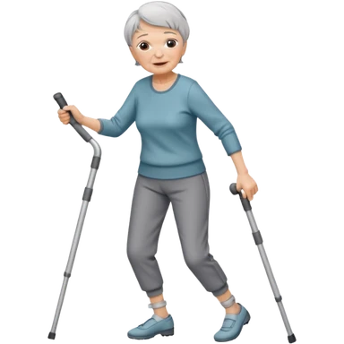elderly woman with pants, short grey hair, and dancing th crutches and with a sorry look emoji
