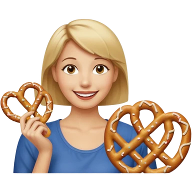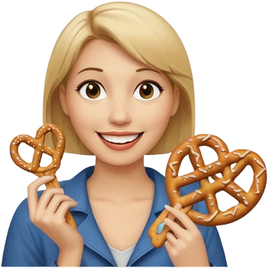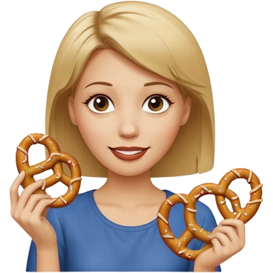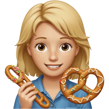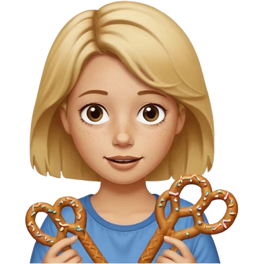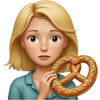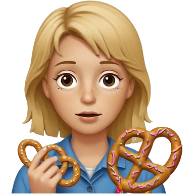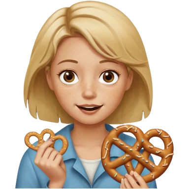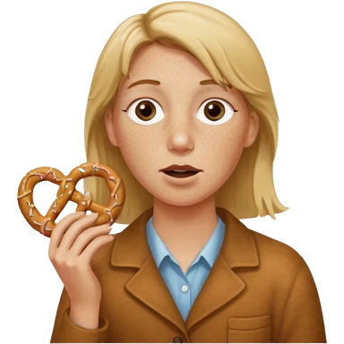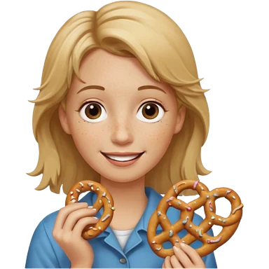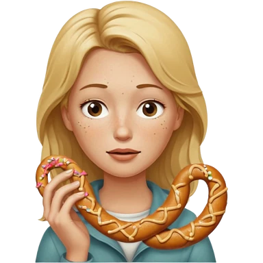 Woman with Dirty blond hair, fair skin with freckles, holding pretzels and winking one eye emoji | AI Emoji Generator