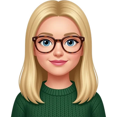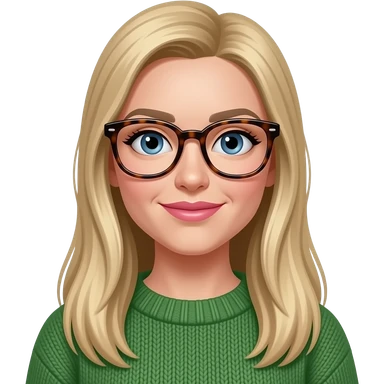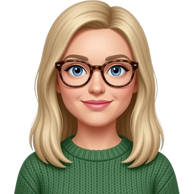 a white woman with long, straight blonde hair. she should be wearing thick rimmed tortise shell glasses, have pinker lips, wearing a dark green sweater and have almond shaped blue eyes. emoji