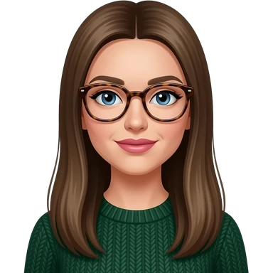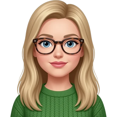 a white woman with long, straight dark blonde hair. she should be wearing thick rimmed tortise shell glasses, have pinker lips, wearing a dark green sweater and have almond shaped blue eyes. emoji